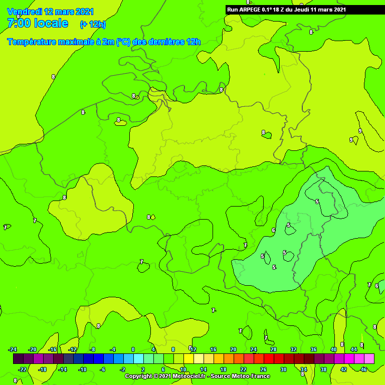 Ces cartes présentent les prévisions du modèle global ARPEGE produit par Météo-France toutes les 6h. Les mises à jour des cartes commencent vers 16h00, 23h05, 4h00 et 11h05. La résolution est de 0.01x0.1° (10 km environ) en Europe et 0.5° pour le monde.