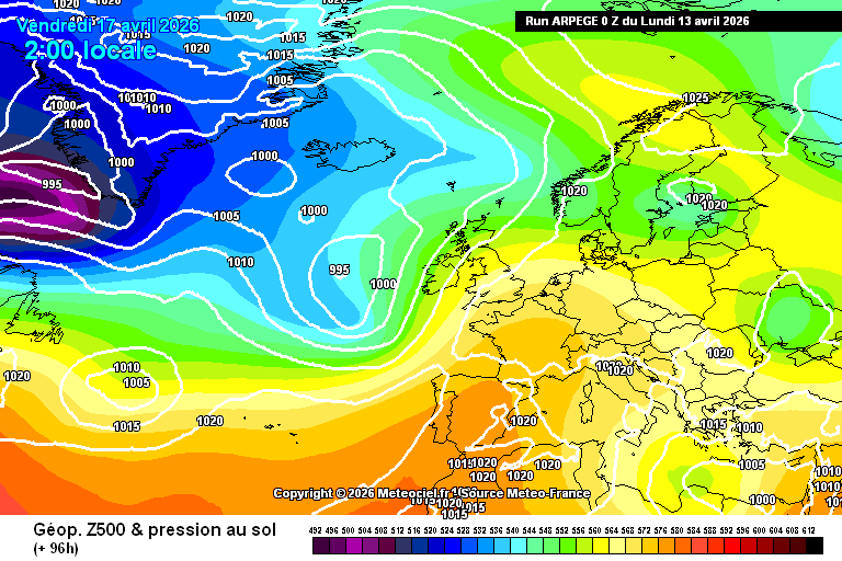 Précisions : Ces cartes présentent les données du modèle ARPEGE 0.25° de Météo-France. Les cartes sont réactualisées rapidement en temps réel à partir de 5h00, 12h00, 17h00 et 0h00. Echéance max. : 102h pour le 00Z, 06Z et 18Z, 114h pour le 12Z Merci à Météo-France pour la disposition de ces données en Open-Data (licence Etalab)