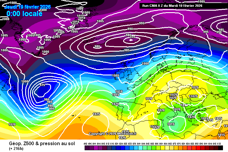 Pression/Geop 500hPaTemp. 850hPaJet StreamPrécipitationsTemp. 2mTemp. 10hPa (stratos.)