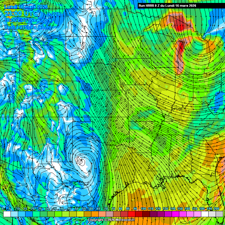 Ces cartes présentent les prévisions du modèle à maille fine HRRR Etats-Unis (High Resolution Rapid Refresh) basé sur WRF pour les prévisions immédiates qui est généré toutes les heures. La résolution est de 3km. Le calcul et la génération des cartes prennent généralement 1h pour une échéance de 18h (et 36h pour les runs de 00Z, 06Z, 12Z et 18Z)