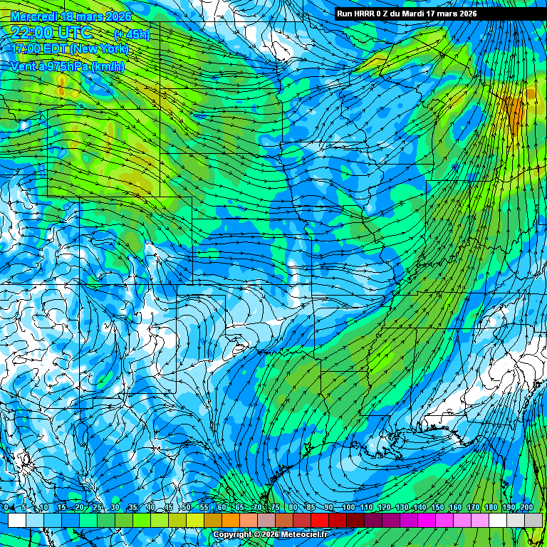 Ces cartes présentent les prévisions du modèle à maille fine HRRR Etats-Unis (High Resolution Rapid Refresh) basé sur WRF pour les prévisions immédiates qui est généré toutes les heures. La résolution est de 3km. Le calcul et la génération des cartes prennent généralement 1h pour une échéance de 18h (et 36h pour les runs de 00Z, 06Z, 12Z et 18Z)