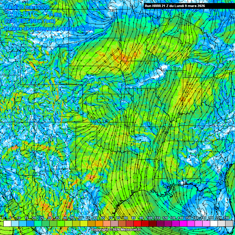 Ces cartes présentent les prévisions du modèle à maille fine HRRR Etats-Unis (High Resolution Rapid Refresh) basé sur WRF pour les prévisions immédiates qui est généré toutes les heures. La résolution est de 3km. Le calcul et la génération des cartes prennent généralement 1h pour une échéance de 18h (et 36h pour les runs de 00Z, 06Z, 12Z et 18Z)
