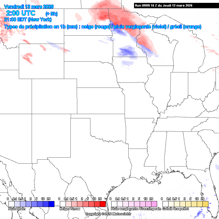 Ces cartes présentent les prévisions du modèle à maille fine HRRR Etats-Unis (High Resolution Rapid Refresh) basé sur WRF pour les prévisions immédiates qui est généré toutes les heures. La résolution est de 3km. Le calcul et la génération des cartes prennent généralement 1h pour une échéance de 18h (et 36h pour les runs de 00Z, 06Z, 12Z et 18Z)